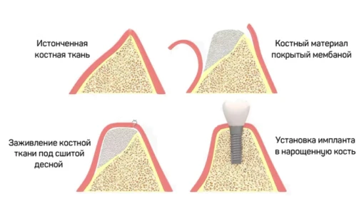 При недостаточной толщине кости челюсти перед имплантацией проводится наращивание кости с использованием искусственного или собственного костного материала.